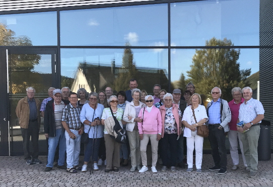 Am 11. Oktober 2023 machten sich knapp dreißig Senioren der Kolpingsfamilie Trossingen in Fahrgemeinschaften auf den Weg mit dem ersten Ziel Wehingen. Der ehemalige Bürgermeister von Wehingen und Reichenbach am Heuberg, Josef Bär, seit einigen Jahren Mitglied der Kolpingsfamilie, hatte zu einer Informationstour zu seinen ehemaligen Wirkungsstätten eingeladen. Erstes Ziel war die auf einem Bergsporn zwischen Gosheim und Wehingen liegende „Bürgle-Kapelle“. Die im Jahr 1887 erbaute und 1902 in den heutigen Zustand umgebaute Kapelle ist den 14 Hl. Nothelfern geweiht. Alle 14 Heiligen sind auf einem kolorierten Holzrelief dargestellt. Roswitha Bär und Walter Haas trugen in der Kapelle ein Fürbittgebet vor. Unterhalb der Kapelle, deren Name auf eine einst dort stehende Burg hinweist, liegt eine Lourdes-Grotte, vor der die Trossinger kurz inne hielten.