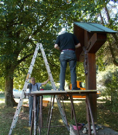 Am Montag, 25. Juli 2022 kam der Anruf zu Walter, dass am heutigen Tag der Finger angebracht werde. Man sei um 9.30 Uhr am Kreuz. Als Walter dort eintraf, war bereits ein Arbeitsgerüst erstellt und eine zweite männliche Person stand oben und bearbeitete den von Manfred Gruler geschnitzten Zeigefinger auf genaue Passform an die Bruchstelle. Es war ebenfalls ein Hobbyschnitzer namens Lothar Raab aus Mühlheim/Donau. Der neue Finger wurde mit einem Stift versehen, der verbliebene Fingeransatz angebohrt und dann ging’s flott voran. Die Verbindungsstelle wurde mit Leim bestrichen und der neue Finger eingesetzt und angedrückt. Schließlich übernahmen die Hobbyschnitzer auch noch die Einfärbung des Fingers, sodass nach Abschluss der Arbeit nicht mehr zu erkennen ist, dass an der rechten Hand von Jesus eine Reparatur stattgefunden hat.